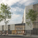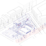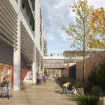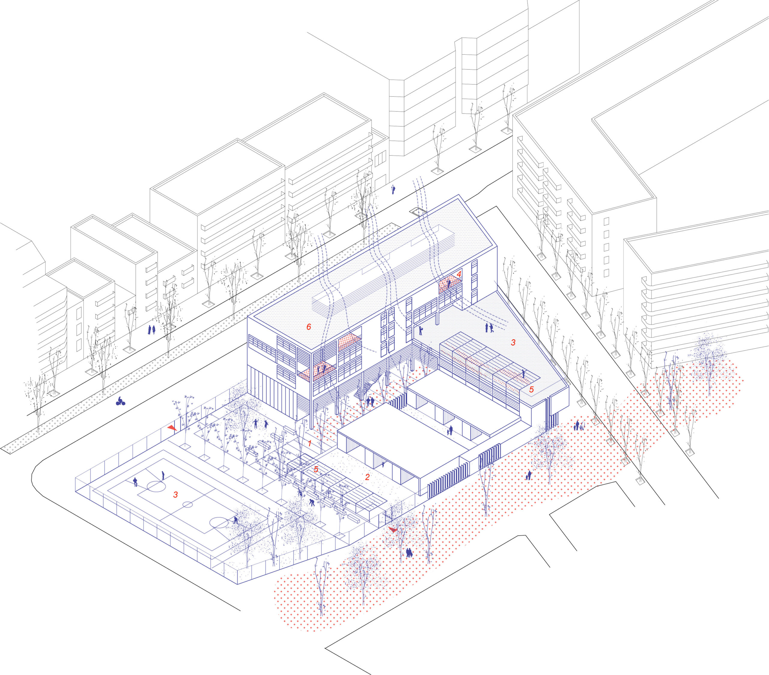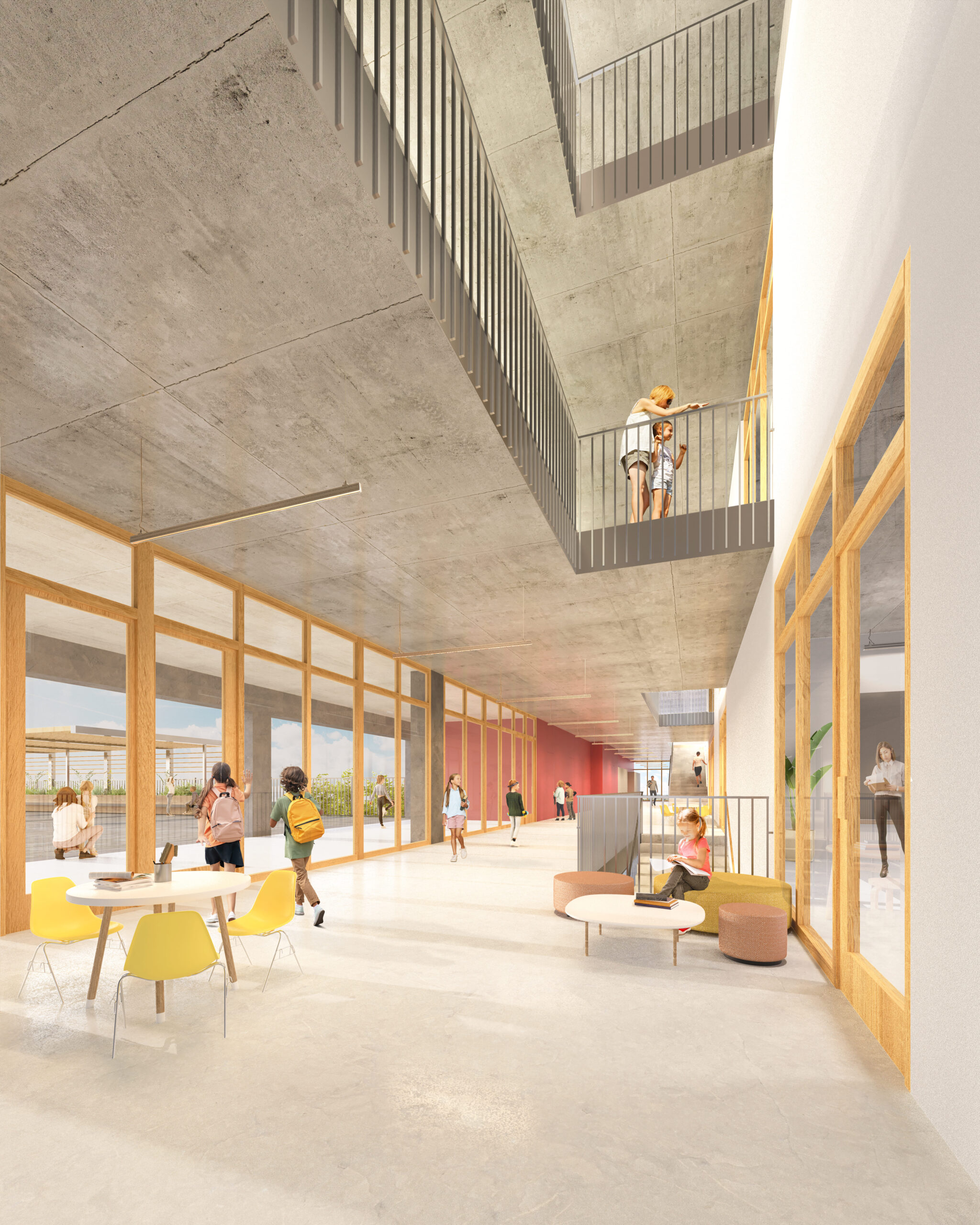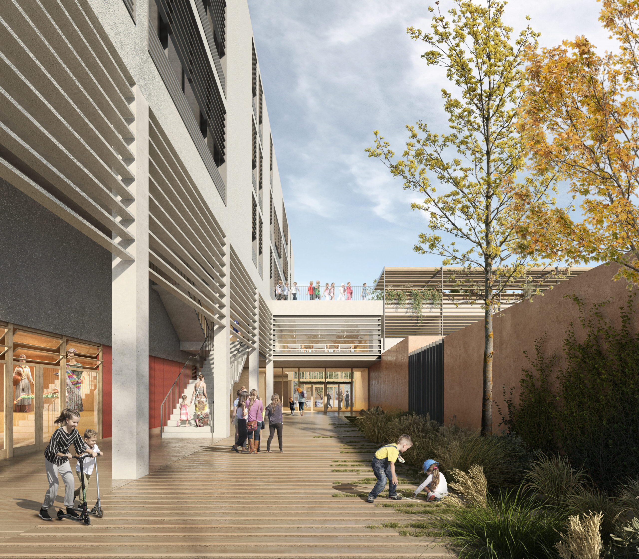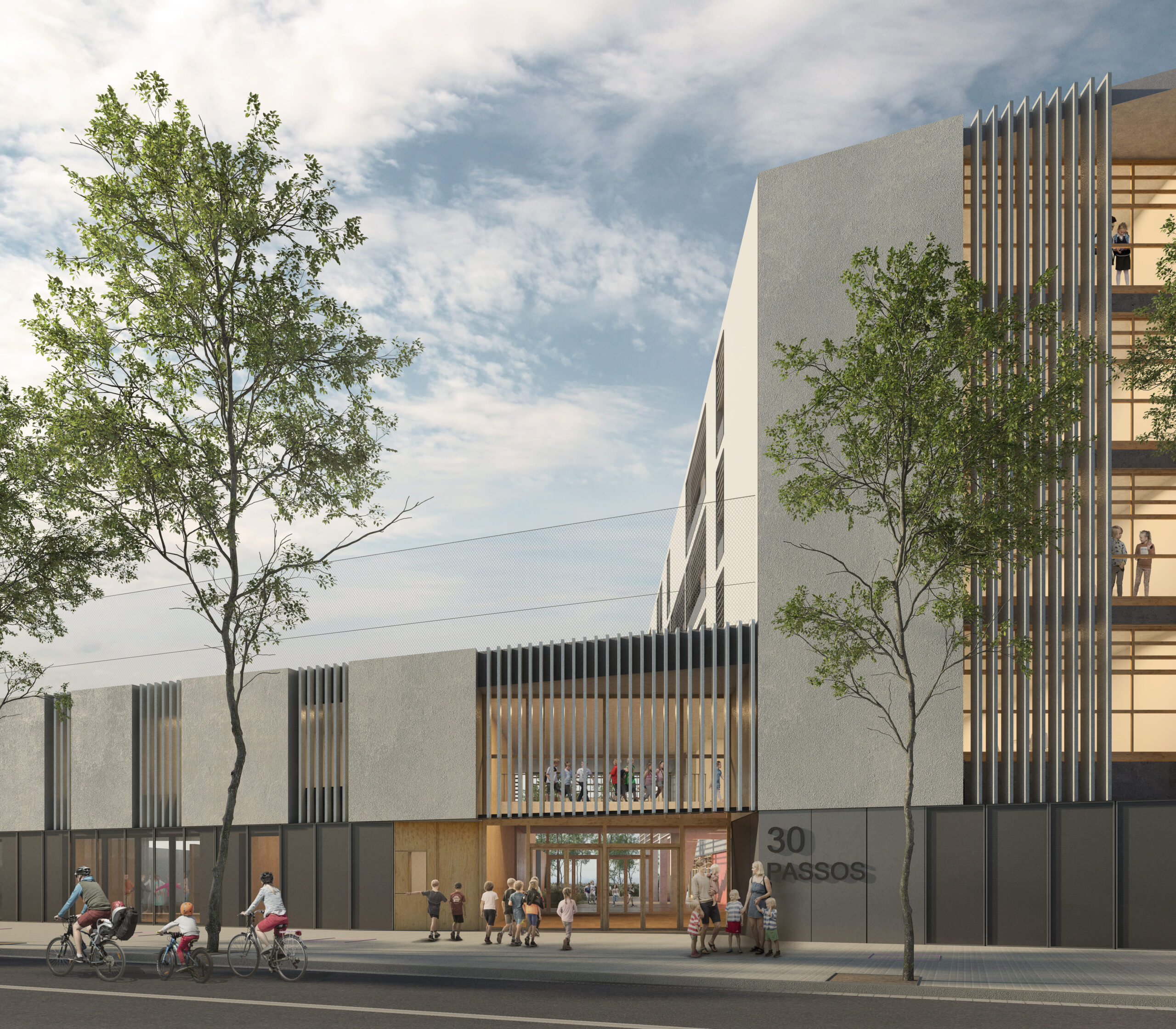 El projecte s’alinea amb el Carrer Berenguer de Palou, reforçant i continuant la trama urbana. A la banda est, l’altura de l’edifici es limita a la planta baixa o planta baixa + 1, amb espais exteriors arbrats que realcen i extenen el futur eix verd entre la Plaça de Kobe, el pati de la Nau Bòstik i el parc adjacent a la Torre de la Sagrera. Entre aquests dos volums, es crea un eix nord-sud, una “carrer interior”, per organitzar i connectar els diversos espais interiors i exteriors de l’escola.