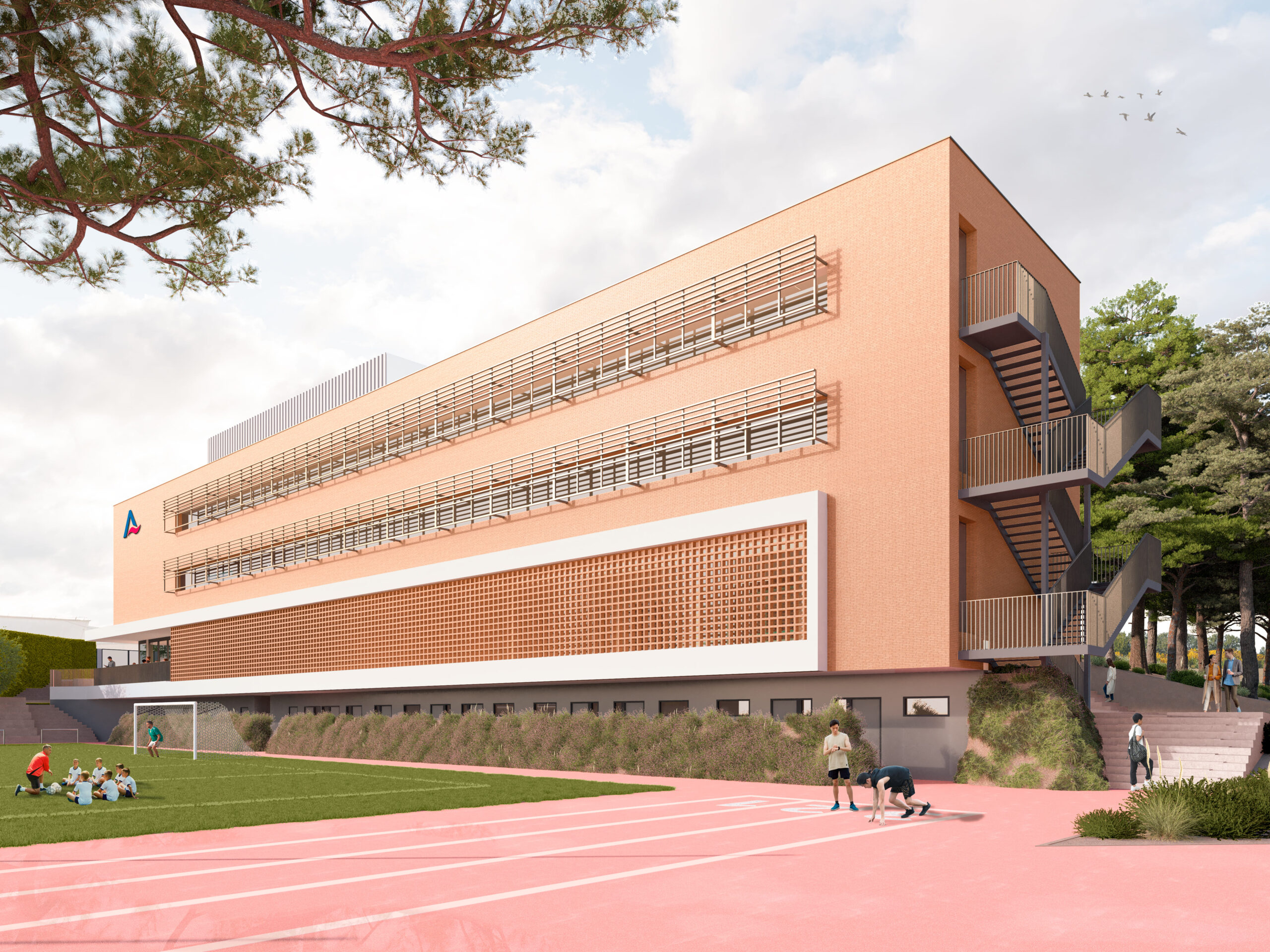 Estructura de quatre plantes que cobreix 1.959 m², dissenyada per oferir als estudiants una experiència educativa excepcional en un entorn privilegiat i sostenible. Situat en un lloc únic amb vistes espectaculars, l’edifici nou compta amb una entrada independent que assegura la privacitat i l’autonomia dels estudiants, tot i estar perfectament connectat amb el campus principal. Aquest disseny harmonitza modernitat, comoditat i funcionalitat en un espai que inspira l’aprenentatge.