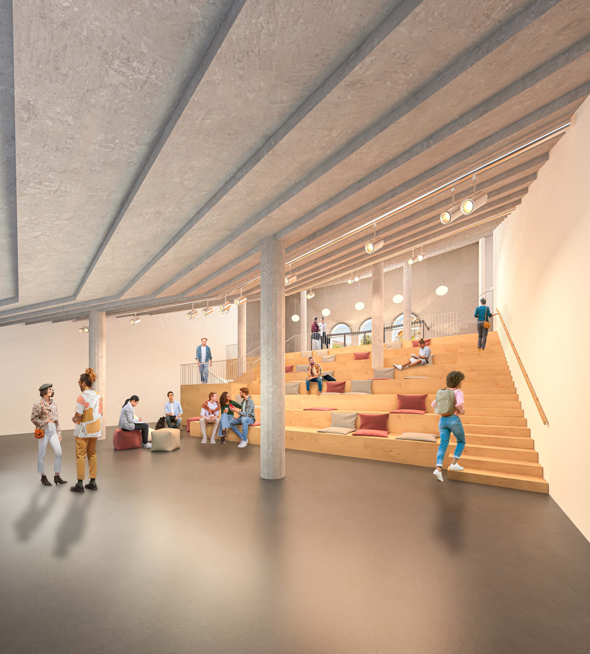 L’Àgora, el Foyer i el vestíbul ofereixen espais flexibles per a actes informals i exposicions. La gran llosa de formigó, emblanquida i suavitzada, integra tots aquests espais, creant un entorn més funcional i acollidor per a activitats artístiques i teatrals.