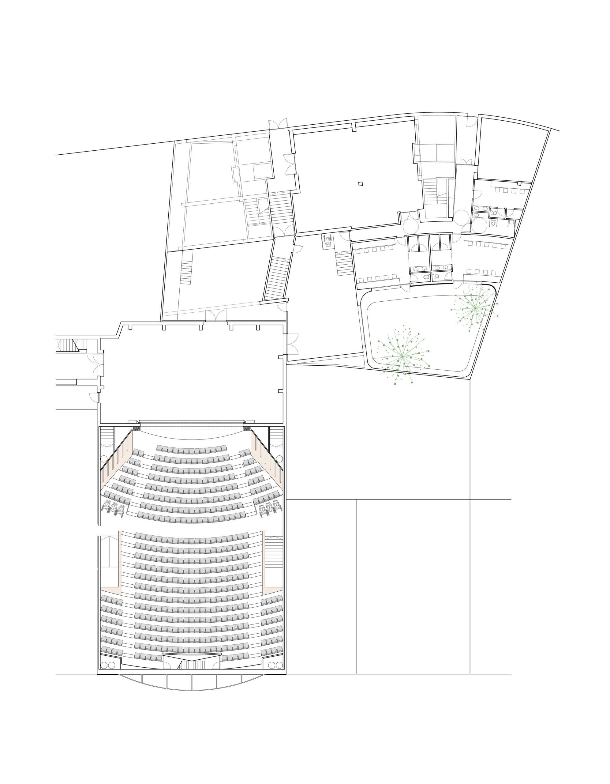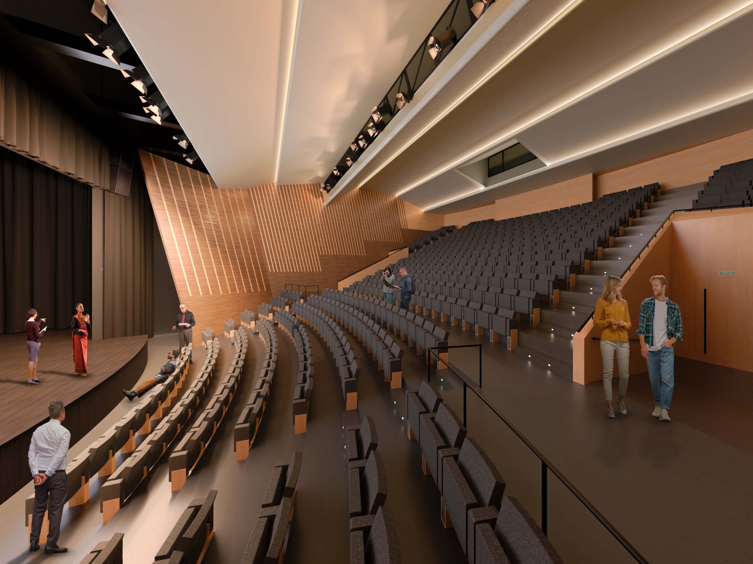 Es treballa la llosa de formigó amb veladures clares per suavitzar-ne la presència, mantenint la seva estructura característica, i alhora es millora la lluminositat i l’acollida del vestíbul. S’incorpora un ascensor que connecta el vestíbul amb la Sala i l’Àgora, creant un espai versàtil i accessible. La renovació de la Sala millora la visibilitat i el confort del públic, amb noves grades concèntriques i la implementació d’un sistema de climatització més eficient. L’acústica s’optimitza mitjançant el sistema “a box in a box”, aïllant les vibracions i potenciant l’harmonia cromàtica amb fusta natural.